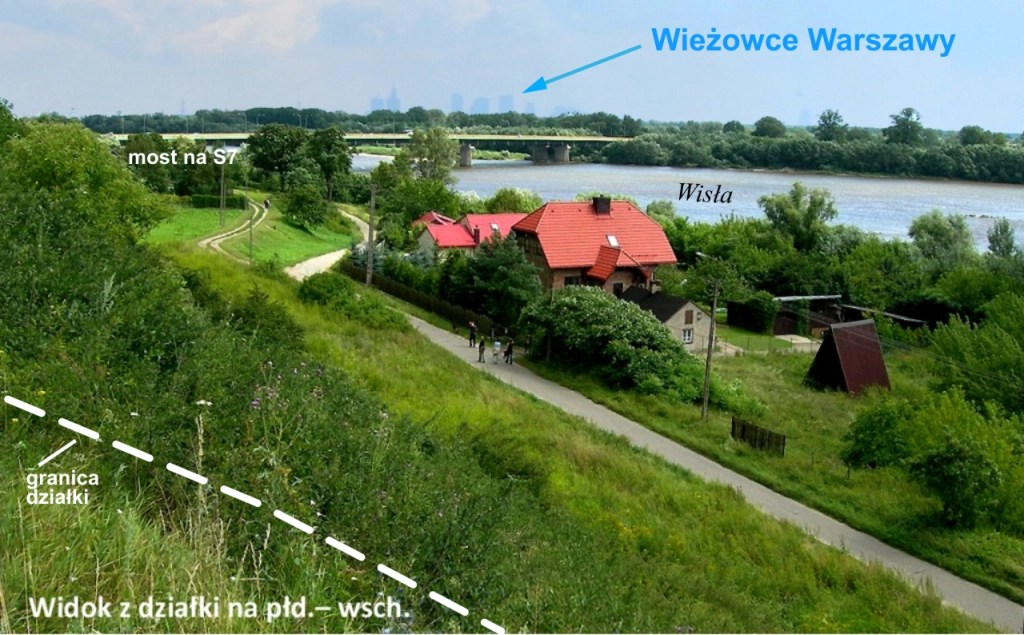 Za mostem trasy szybkiego ruchu S7 na Wiśle widać wprost z działki stary spichlerz zbożowy Twierdzy Modlin z 1844 roku, leżący przy ujściu Narwi do Wisły. Obok widać wyraźnie różnicę koloru wód i most drogowo-kolejowy do Nowego Dworu Mazowieckiego.